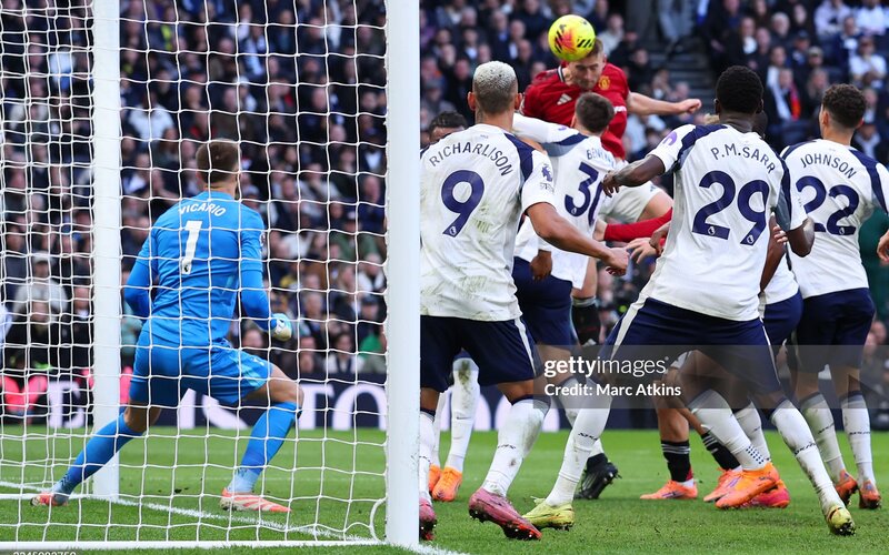 Mason Mount thay De Ligt đảm nhận vai trò cản thủ môn. Khi Fernandes chạy đà, De Ligt giả vờ di chuyển một hướng rồi tách người kèm Brennan Johnson, sử dụng Senne Lammens lên tham gia tấn công làm “tấm chắn”. Yoro kéo Micky van de Ven ra trung lộ, còn Mount đứng chắn ngay trước mặt thủ môn Guglielmo Vicario, khiến anh này không thể băng ra. Shaw cản Rodrigo Bentancur ở cột xa, mở ra khoảng trống cho De Ligt đánh đầu tung nóc lưới, gỡ hòa cho United.